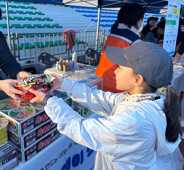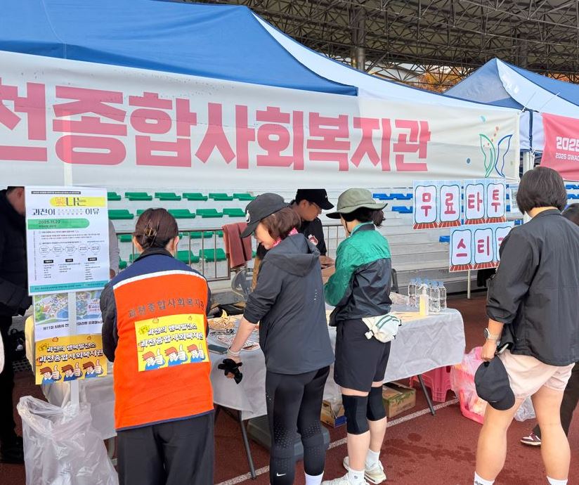 복지관 부스에서는 시민들이 자발적으로 라면, 통조림, 즉석밥 등 다양한 식료품을 기부하며 이웃을 위한 작은 응원을 실천했습니다. 또한, 과천의 마스코트 ‘토리아리’를 활용한 타투스티커 체험존에서는 참가자들이 “오늘도 가족 덕분에”, “우리 아이 합격기원” 등의 구호가 담긴 스티커를 부착하며 마라톤의 열기 속에서 즐거움과 의미를 함께 나누었습니다.