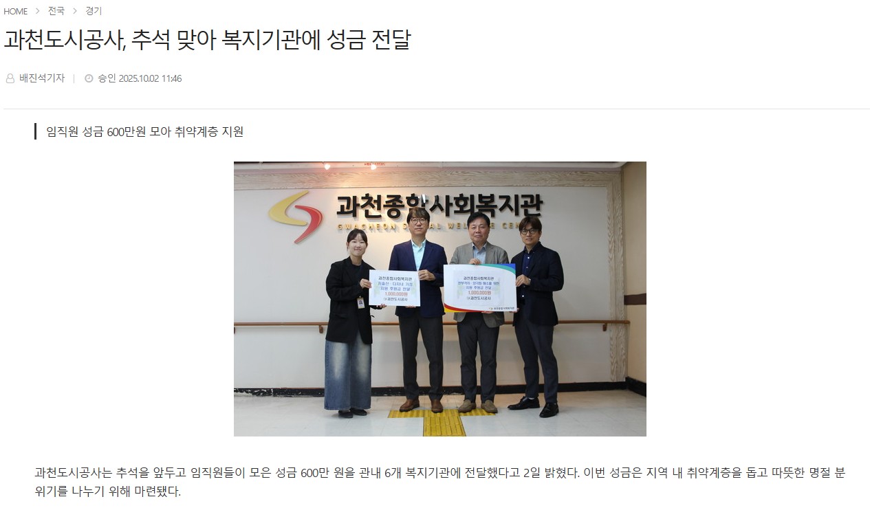 과천도시공사, 추석 맞아 복지기관에 성금 전달