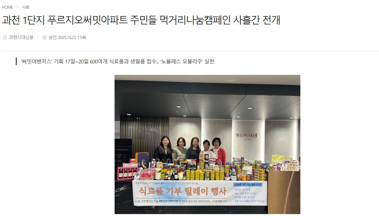과천 1단지 푸르지오써밋아파트 주민들 먹거리나눔캠페인 사흘간 전개